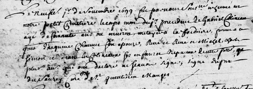 Le neufviesme jour de novembre 1699 fut par nous soussigné inhumé en notre petit cimetiere le corps, mort du jour précédent, de Gabriel COLINEAU agé de soixante ans ou environ, metayer à la Foidrière, furent à ce present Jacquine CHAUVET son épouse, René et René et Michel, Charles, Simon et Jean les COLINEAUX ses enfant et nepveux de cette paroisse et plusieurs autres qui ont declaré ne scavoir signer.