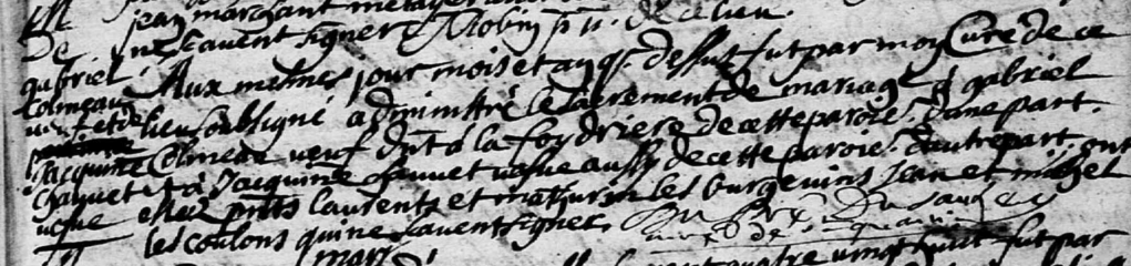 Aux mesmes jour mois et an que dessus fut par moy curé de ce lieu soubsigné administré le sacrement de mariage à Gabriel COLINEAU veuf demeurant à La Foydrière de cette paroisse d’une part et à Jacquine CHAUVET veuve aussy de cette paroisse, ont estéz présents Laurent et Mathurin les BURGEVINs, Jean et Michel les COULONs qui ne savent signer.