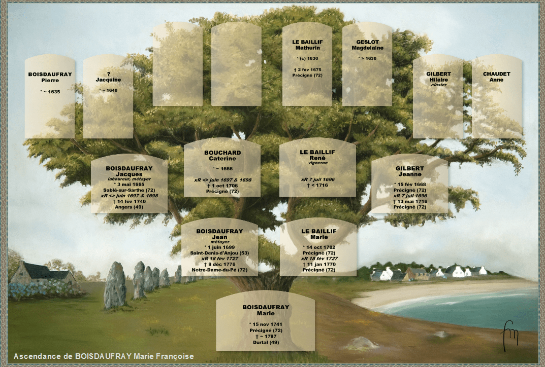 L’un des fils de Jacques BOISDAUFRAY, Jean, s’est marié avec Marie LE BAILLIF, de cette union est née Marie BOISDAUFRAY qui se mariera à son tour avec Jacques CHAIGNON, le 18 novembre 1760, toujours à Précigné.