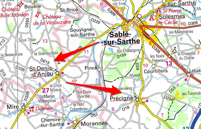 C’est d’abord Catherine BOUCHARD (dont je descends) l’heureuse élue. D’elle, je sais encore peu de chose si ce n’est qu’elle aura quatre enfants dont deux décèderont en bas-âge. De son mariage, qui a dû avoir lieu vers le milieu de l’année 1697, pas de trace.  [J’ai trouvé ce mariage… 4 ans plus tard, à Sablé ! Moraité : il ne faut jamais désespérer !] Ses deux premiers enfants sont nés à Saint-Denis d’Anjou où Jacques BOISDAUFRAY est laboureur. Au cours de l’année 1702, la famille déménage à Précigné (72), paroisse Saint Pierre,  où est baptisé le quatrième et dernier enfant de Catherine BOUCHARD qui décède le 1 octobre 1706. Désormais la famille ne bougera plus de Précigné, Jacques y sera métayer pendant au moins une trentaine d’années, tout d’abord au lieu-dit des Bavousières, puis à la Grange, enfin à l’Effrayère.