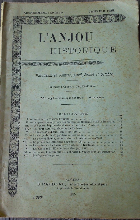 Sans oublier qu’il fut directeur de la publication de la Revue Andegavania ( 1904-1941) et de L’Anjou Historique.