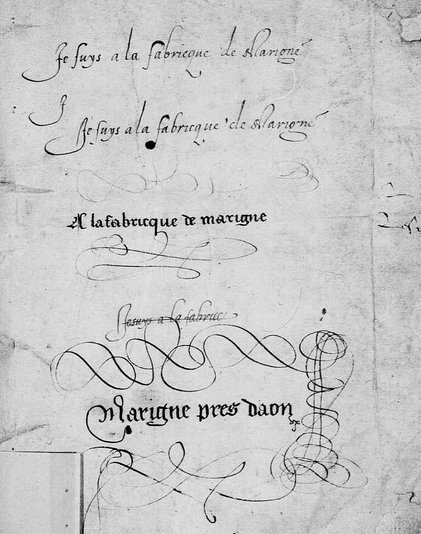 On dirait que le copiste s’est entraîné à écrire plusieurs fois la même formule. J’imagine que lorsqu’il écrit « Je suys à la fabrique de Marigné », il parle au nom du registre et qu’il faut comprendre : « Ce registre appartient à la fabrique de Marigné.«