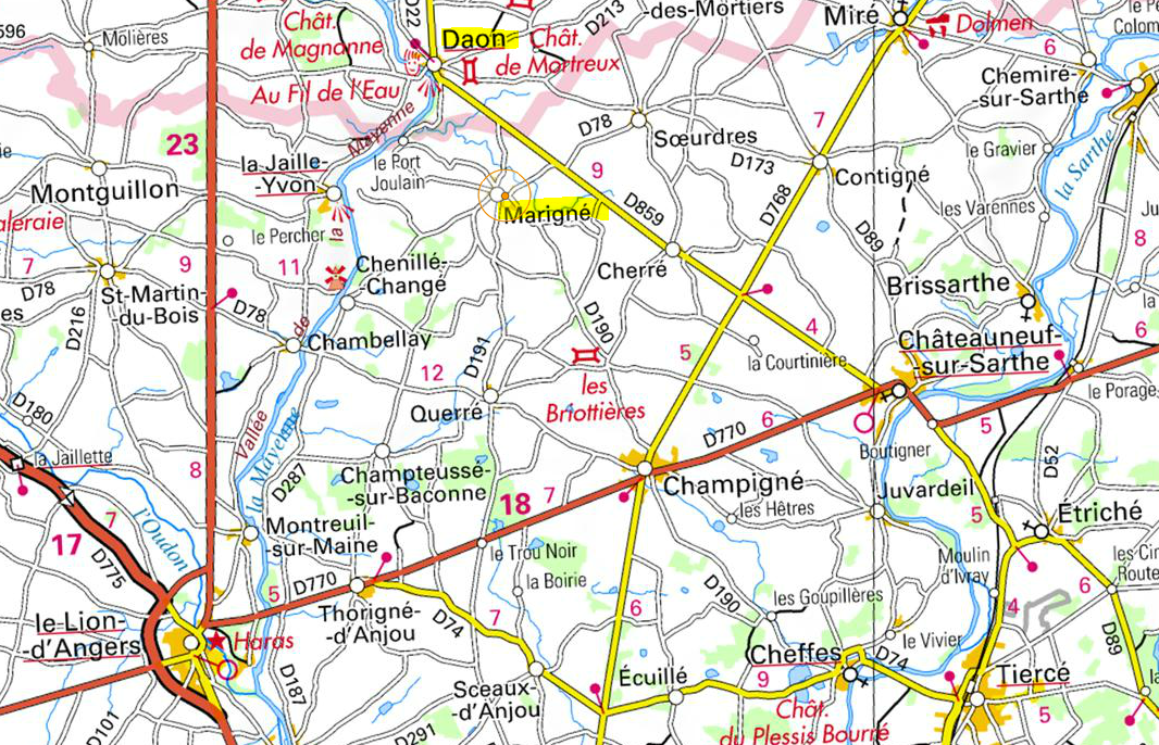 Au fil de mes recherches, l’étude de la famille HEULLIN (voir Pierre HEULLIN, notaire à Marigné) qui fera bientôt l’objet d’un article) m’a conduit à Marigné. Ce petit village, situé dans le Maine-et-Loire à la limite du département de la Mayenne, s’appelait autrefois Marigné-près-Daon – ou même Marigné sous-Daon – et si l’on observe une carte, on comprend pourquoi.