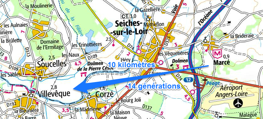 Catherine BEAUMONT est la plus ancienne des grands-mères maternelles que j’ai pu retrouver à ce jour. Elle est née dans le dernier quart du seizième siècle, non loin sans doute de Marcé, dans le Maine-et-Loire. Son mari, Jehan ROUY, y est vigneron et c’est dans ce même village que naîtront sa fille, Françoise ROUY, en 1604, puis sa petite-fille, Françoise DURDON, en 1627. Ces trois femmes sont respectivement mes grands-mères maternelles à la quatorzième, treizième et douzième génération. Leurs descendantes, quelques-unes de mes arrière-grands-mères, ma grand-mère et ma mère, naîtront à Villevêque, à moins de dix kilomètres de Marcé !