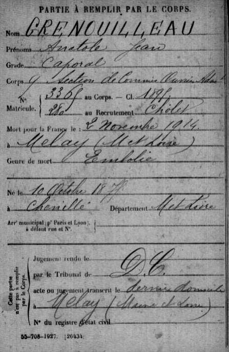 A l’heure de la mobilisation, Anatole a presque 40 ans. Sa fiche matricule ne donne pas de précisions sur ses activités pendant les premiers mois de la guerre. Mais, lorsqu’il décède d’une embolie, le deux novembre 1914, il se trouve chez lui, à Melay. Peut-être était-il en permission ?
