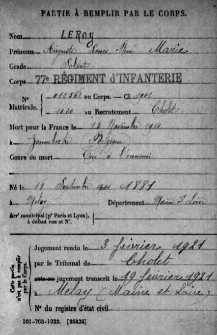 Auguste LEROY est, à ma connaissance, le dernier (et le septième) soldat de Melay « Mort pour la France » en 1914, il ne sera, malheureusement, pas le dernier de la Grande Guerre…