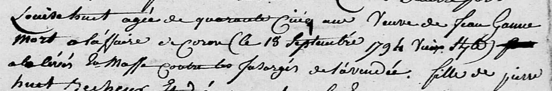 Louise HUET y est dite « Veuve de Jean GANNE mort à l’affaire de Coron (le 18 septembre 1794 vieux style) à la levée en masse contre les insurgés de la Vendée« . (La date « 1794 » est erronée comme on peut le voir ci-dessous.)