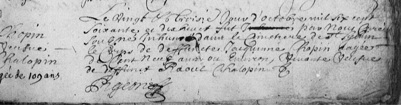 « Le vingt et troisième jour d’octobre mil six cent soixante et dix huict fut par nous curé soussigné inhumée dans le cimetière de Saint Sylvin le corps de deffuncte Jacquinne CHOPIN aagée de cent neuf ans ou environ, vivante veufve de deffunct Raoul CHALOPIN. »