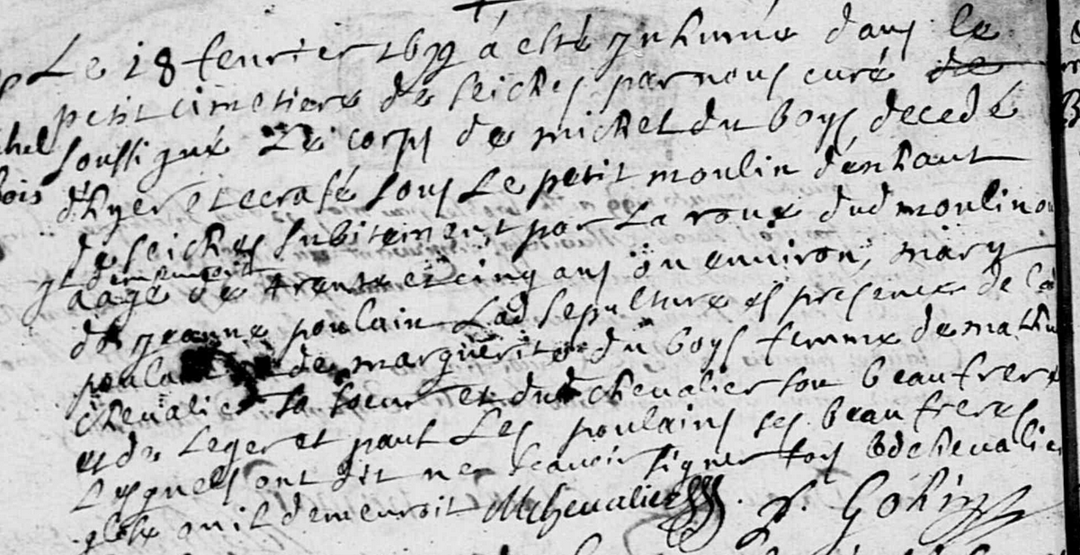 « Le 18 feuvrier 1699 a esté inhumé dans le petit cimetiere de Seiches par nous curé soussigné le corps de Michel DU BOYS décédé d’hyer, écrasé sous le petit moulin d’en haut de Seiches, subitement par la roue dudit moulin où il demeuroit, aagé de trente et cinq ans ou environ, mary de Jeanne POULAIN, la sépulture en présence de ladite POULAIN, de Marguerite DU BOYS femme de Mathurin CHEVALIER et sa soeur et dudit CHEVALIER son beau frère et de Léger et Paul les POULAINs ses beau frères, lesquels ont dit ne sçavoir signer fors ledit CHEVALIER. (Glose « où il demeuroit ») »