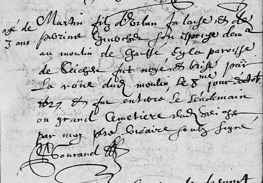 « Martin, filz d’urban FALAISE et de Perrine GUERCHER son espouse demeurant au moulin de Chaussé en la paroisse de Seiches fut noyé et brisé par la roue dudit moulin, le 8ème jour d’octobre 1627 et fut enterré le lendemain au grand cemetiere dudit Seiches par moy prestre vicaire soubz signé. »