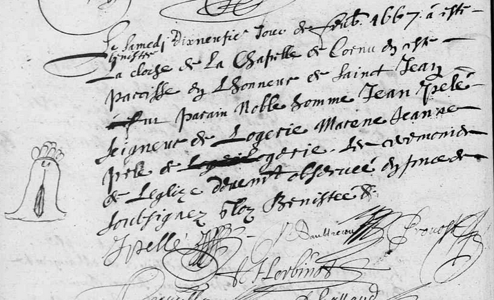 « Le samedi dixneufieme jour de feubvrier a esté béniste la cloche de la Chapelle de Cornu en ceste paroisse en l’honneur de Sainct Jean, fut parain Noble Homme Jean PELÉ seigneur de Logerie, marene Jeanne PELÉ de Logerie, les cérémonies de l’églize deuement observées en présence des soubsignez. »