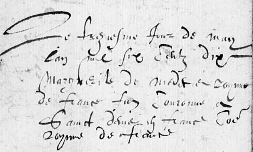 « Le treiziesme jour de may l’an mil six centz dix Marguerite de Medicis royne de France fut couronnée à Sainct Denis en France comme roynne de France »