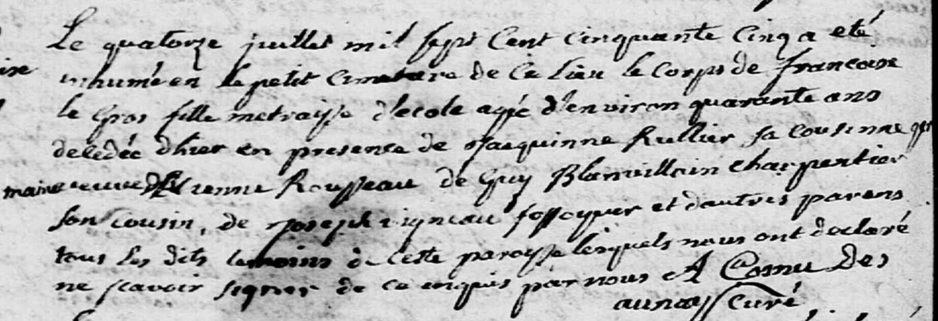 Le quatorze juillet mil sept cent cinquante cinq a eté inhumé en le petit cimetiere de ce lieu, le corps de Françoise LE GROS, fille metraisse d’école, agée d’environ qurante ans, decedée d’hier, en presence de Jacquinne RULLIER sa cousinne germaine veuve d’Estienne ROUSSEAU, de Guy BLANVILLAIN charpentier son cousin, de Prosper VIGNEAU fossoyeur et d’autres parens, tous les dits temoins de cette paroisse, lesquels nous ont declaré ne scavoir signer de ce enquis, par nous A. Cornu Desaunay, curé.
