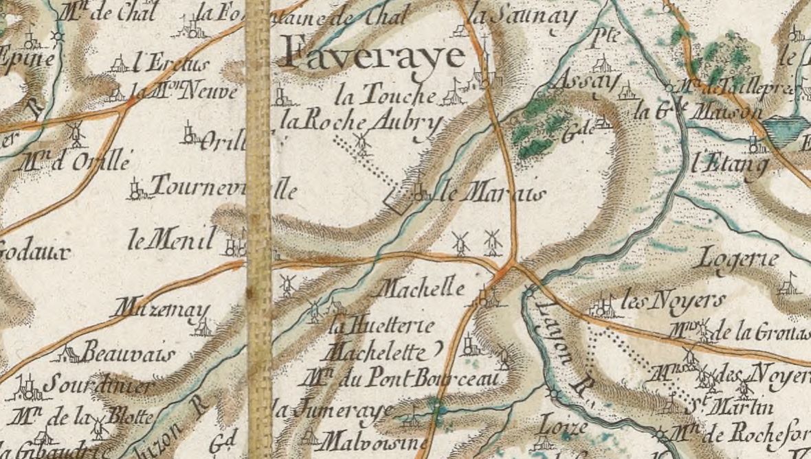 Les anciennes paroisses de Faveraye et de Machelle traversées par le Layon, dans lequel se noya peut-être notre inconnu… (Source Gallica)