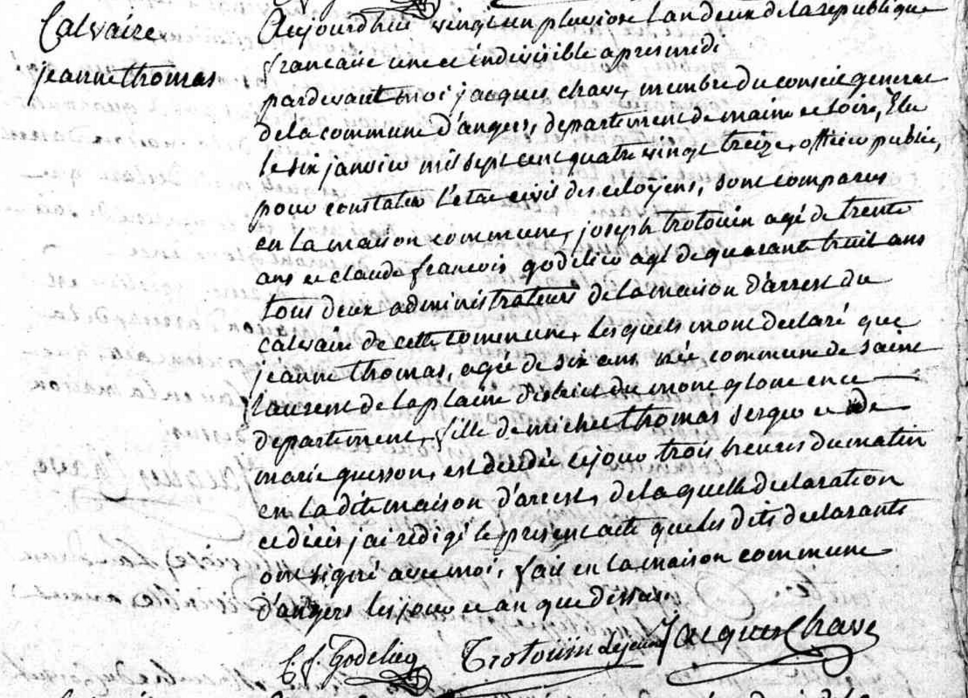 Aujourd’hui vingt un pluviose l’an deux de la République Française une et indivisible après midi, par devant moi Jacques CHAVE, membre du conseil général de la commune d’Angers, département de Maine et Loire, élu le six janvier mil sept cent quatre treize, officier public, pour constater l’état civil des citoyens, sont comparus Joseph TROTOUIN agé de trente ans et Claude François GODELIER agé de quarante trois ans tous deux administrateurs de la maison d’arrest du Calvaire de cette commune, lesquels m’ont déclaré que Jeanne THOMAS âgé de six ans, née commune de Saint Laurent de La Plaine, discrict du Montglone en ce département, fille de Michel THOMAS serger et de Marie QUESSON, est décédée ce jour, trois heures du matin en la dite maison d’arest, de laquelle déclaration et décès, j’ai rédigé le présent acte que les dicts déclarants ont signé avec moi, fait en la maison commune d’Angers, le jour et an que dessus.