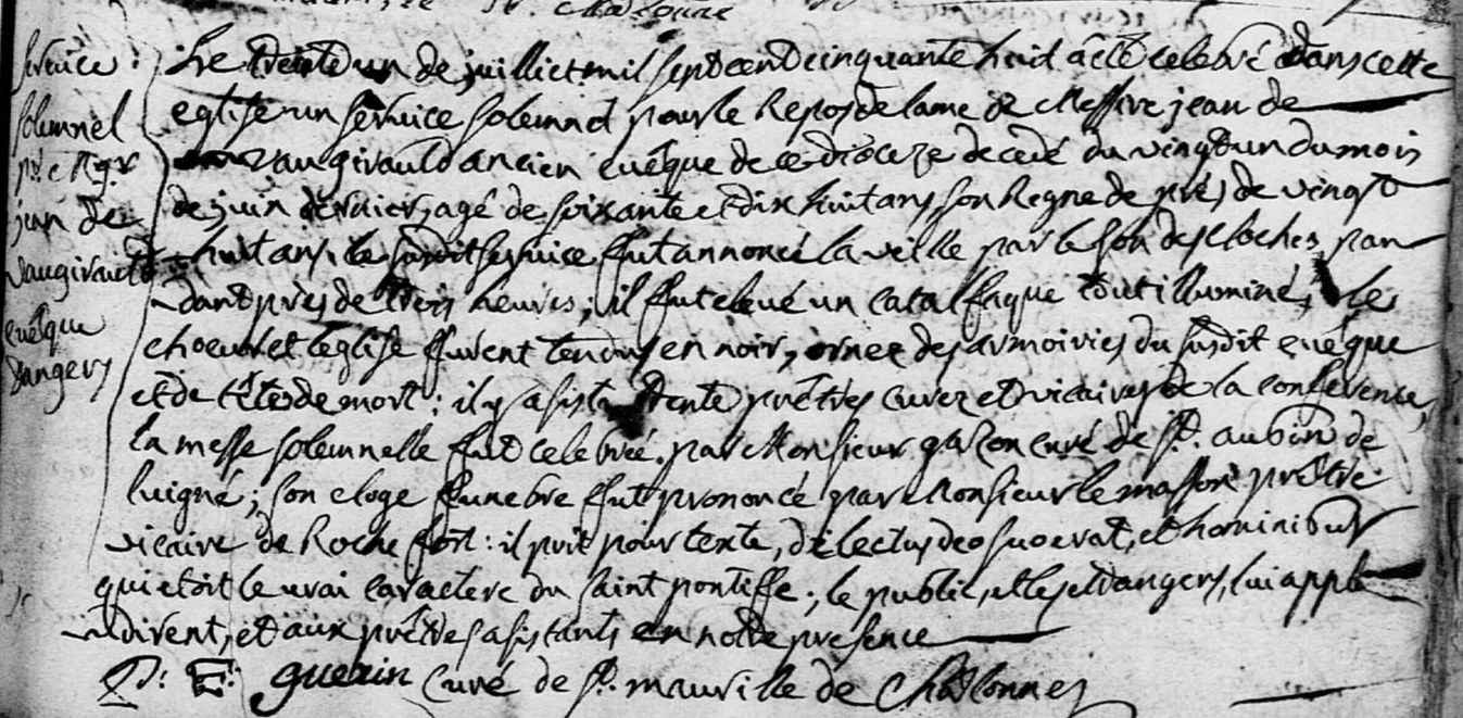 Le trente un de juilliet mil sept cent cinquante huict a été celébré dans cette église un service solennel pour le repos de l’ame de Mestre Jean de VAUGIRAULD, ancien evêque de ce diocèse, decedé du vingt et un du mois de juin dernier, agé de soixante et dix huit ans, son regne de près de vingt huit ans. Le susdit service fut annoncé la veille par le son des cloches, pendant près de trois heures, il fut élevé un catafalque tout illuminé, le choeur et l’église furent tendus en noir, ornés des armoiries du susdit evêque et de tête de mort : il y asista trente prêtres, curés et vicaires de la conference, la messe solennelle fut celebrée par Monsieur GAZON curé de Saint Aubin de Luigné ; son éloge funèbre fut prononcé par Monsieur LEMASSON prêtre vicaire de Rochefort : il prit pour texte, Delectus deo fuerat et hominibus, qui etoit le vrai caractere du Saint Pontiffe ; le public et les estrangers lui applaudirent, et aux prêtres assistants, en notre presence. P. E. Guerin, curé de Saint Maurille de Chalonnes.