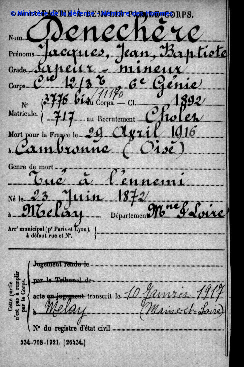 Jacques Jean DENECHERE, Mort pour la France le 29 avril 1916, Poilu de Melay (49)