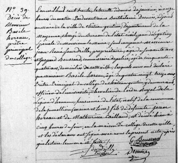 L’an mil huit cent trente, le trente du mois de janvier à onze heures du matin, par devant nous Barthélémi DESAËS, adjoint au maire de la ville de Châteu-Gontier, Département de la Mayenne, chargé du bureau de l’état-civil, par délégation spéciale de Monsieur le Maire, sont comparus Messieurs Jean René SOURDRILLE propriétaire, âgé de soixante ans et Gaspard BOUSSARD, commissaire de police, âgé de cinquante quatre ans, domiciliés de cette ville, lesquels nous ont déclaré que monsieur Basile HOREAU âgé de quatre vingt treize ans, Prêtre Principal du collège de Château-Gontier, y demeurant, officier de l’université, Chevalier de l’Ordre Royal de la Légion d’honneur, pensionné de l’état, natif de la commune de La Jumellière (Maine-et-Loire), fils de défunts Jean HOREAU et de Mathurine CAILLAUD, est décédé hier à cinq heures du soir , en la maison du collège de cette ville, et les déclarants ont signé avec nous le présent acte après que lecture leur en a eté faite.