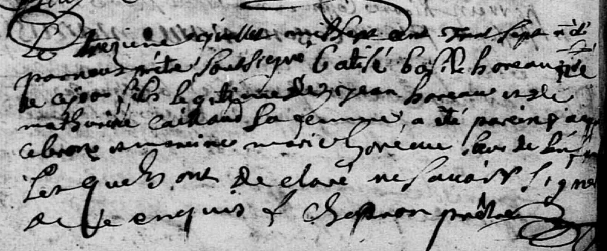 Le treziesme juillet mil sept cent trente sept a eté par nous prêtre soussigné batisé Basile HOREAU né de ce jour fils légitime de Jean HOREAU et de Mathurine CAILLAUD sa femme, a eté parein Jacques CEBRON et maraine Marie HOREAU soeur de l’enfant, lesquels ont declaré ne savoir signer de ce enquis.