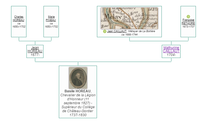 Basile HOREAU est le fils de Jean HOREAU et de Mathurine CAILLAUT, elle-même fille de Jean CAILLAUT, métayer de la Bottière à La Jumelière, et de Françoise RETHORÉ, mes ancêtres directs à la génération 10.