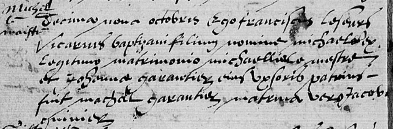 Le dix neuf octobre, moi François LEFEVRE vicaire, j’ai baptisé un fils nommé Michel, fils issu du légitime mariage de Michel LE MESTRE et de Jeanne GARANTIER sa femme, le parrain fut Michel GARANTIER, la marraine la femme de Jacob GUINIER.