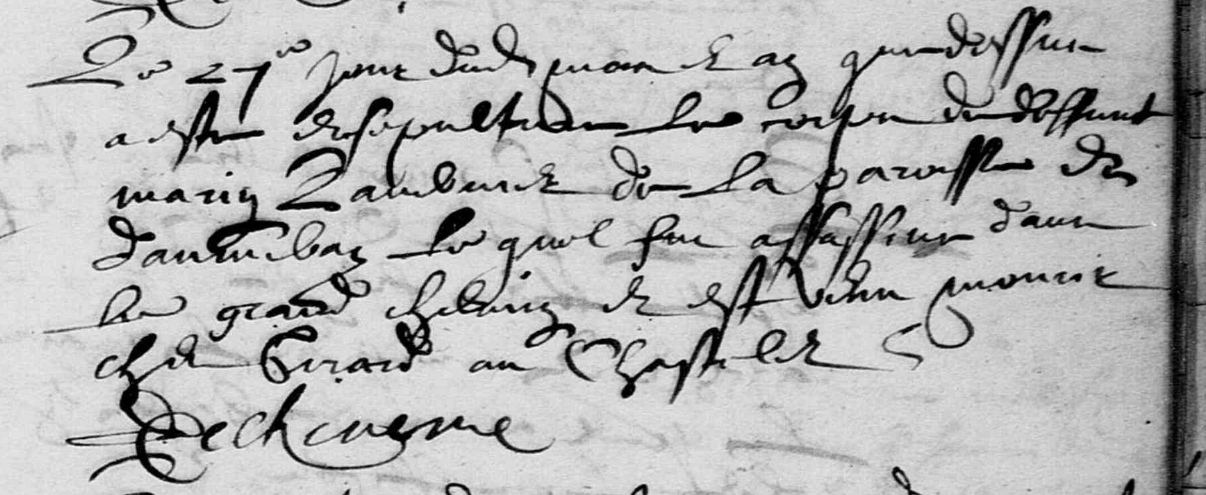 Le 27e jour dudit mois et an que dessus a esté ensepulturé le corps de deffunt Marin LAMBERT de la paroisse de Daumeray, lequel fut assassiné dans le grand chemin et est venu mourir chez GIRARD au Chastelet.
