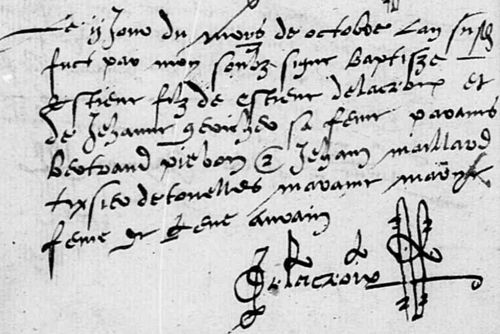 Le ii jour du moys de octobre l’an susdit fuct par moy soubz signé baptizé Estiene filz de Estiene DELACROIX et de Jehanne GERICHER sa femme, parains Bertrand PIEBON et Jehan MAILLARD tixsier de Tonelles, maraine Marye femme de René AURAIN.