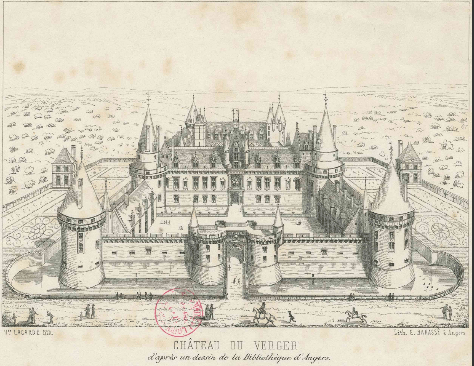 • Château du Verger, d’après un dessin de la Bibliothèque d’Angers. Par H. Lagarde, lithographie. Extrait du Bulletin historique et monumental de l’Anjou d’Aimé de Soland, 1861-1862, tome VII, planche II, p.6, Angers, imprimerie-librairie de Eugène Barassé, 1862. (Source-AD49)