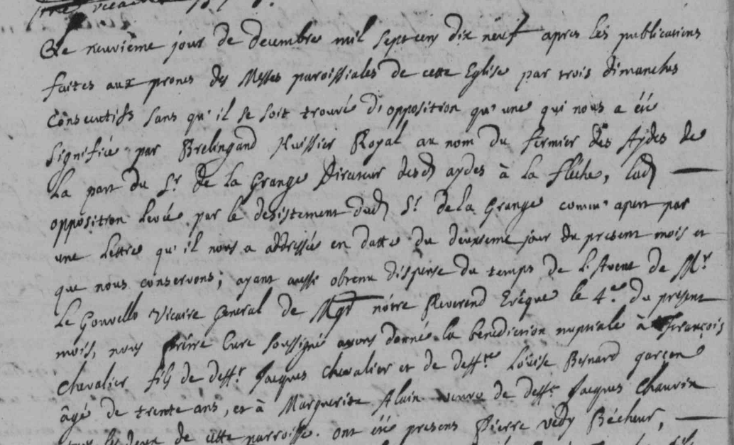 Le neuvième jour de décembre mil sept cens dix neuf après les publications faites aux prosnes des messes paroissiales de cette Eglise par trois dimanches consécutifs sans qu’il se soit trouvé d’opposition qu’une, qui nous a été signifiée par BRELINGAND huissier Royal, au nom du fermier des Aides de la part du sieur de La Grange directeur desdites aydes à La Flèche, ladite opposition levée par le desistement dudit Sieur de La Grange comme apert par une lettre qu’il nous a addressée en datte du deuxieme jour du present mois et que nous conservons ; ayant aussi obtenu dispense du temps de l’Avent de Monseigneur LE GOUVELLO vicaire général de Monseigneur notre Reverend Eveque, le 4e du present mois, nour prieur curé soussigné avons donné la bénédiction nuptiale à François CHEVALIER, fils de deffunt Jacques CHEVALIER et de deffuncte Louise BESNARD garçon âgé de trente ans, et à Marguerite ALAIN veuve de deffunt Jacques CHAUVIN, tous les deux de cette paroisse, ont été présents Pierre VEDY bêcheur, Jean GOGUELET valet domestique de la veuve ROYNÉ, René TRONCHET fils de deffunt René TRONCHET, François PETITEAU fils de deffunt Mathurin PETITEAU, tous de cette parroisse, lesquels ont declaré ne savoir signer, fors le soussigné. Signé – François Petiteau – R. Pelletier présent, curé de Bazouges.