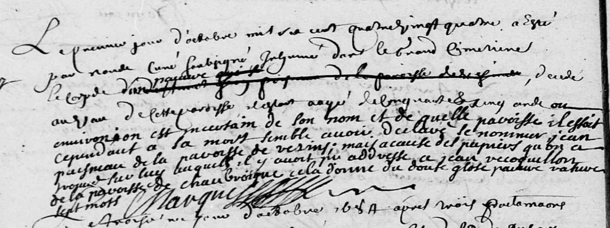 Le premier jour d’octobre mil six cent quatre vingt quatre a esté par nou curé soubsigné inhumé dans le Grand Cimetiere, le corps d’un pauvre,