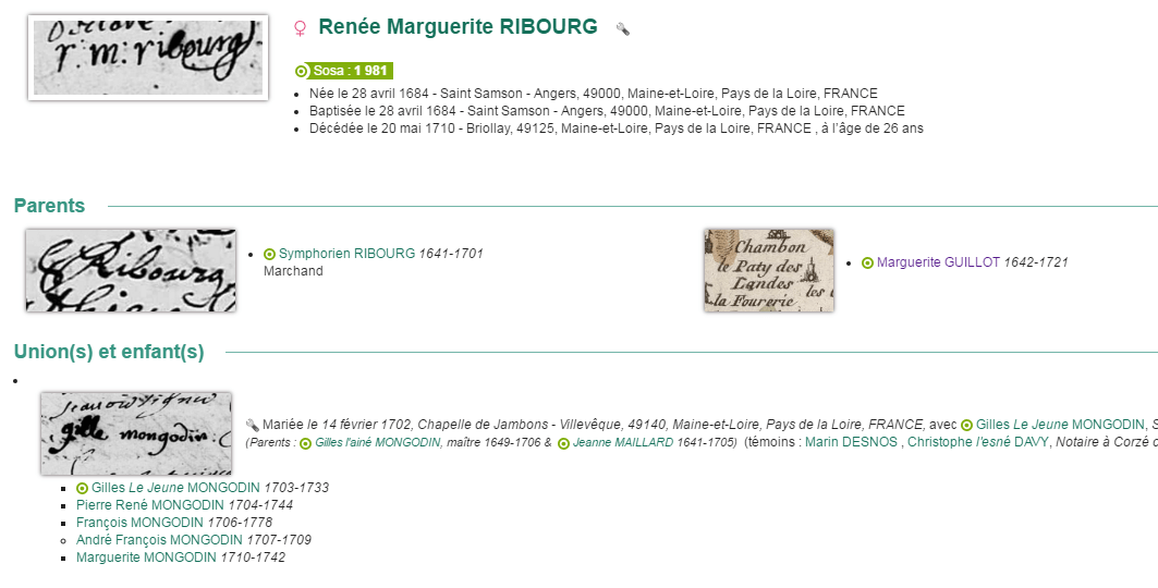 Renée Marguerite RIBOURG avait été baptisée le 28 avril  1684 à Angers, paroisse Saint Samson.