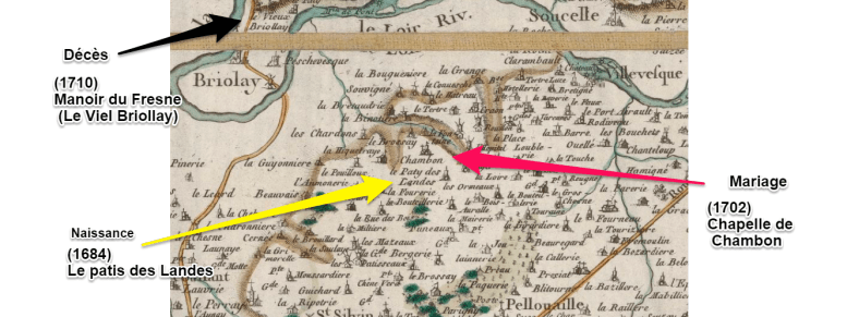 Le mariage a lieu, comme celui de ses parents, dans la chapelle de Chambon (ou Jambon) le 14 février 1702, mais l’acte est transcrit sur les registres de Villevêque et non sur ceux de Pellouailles. Renée Marguerite a 17 ans. Désormais elle quitte Pellouailles et sa maison du Pâtis des Landes où sa mère, veuve, réside encore, pour aller vivre à Briollay avec son mari, Gilles MONGODIN, sieur du Fresnes. (Le manoir de Fresnes se trouvait au village du Vieil Briollay).