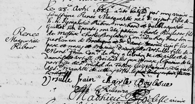 Le 28 e avril 1684 a été baptisée par moy vicaire soussigné Renée Marguerite née de ce jour fille de h.h. Symphorien RIBOUR marchand et de Marguerite GUILLOT son épouse, ont été parain Charles BOYLESVE, fils de messire Charles BOYLESVE conseiller du Roy dans son parlement de Bretagne et de dame Jeanne CUPIF ses pere et mere, marraine damoiselle Ursulle, fille de Monsieur FRAIN conseiller du Roy à l’election de cette ville et de damoiselle Ursulle BOISARD ses pere et mere, le parain de la paroisse de St Michel du Tertre, la maraine de la paroisse de St Maurille de cette ville, le père de l’enfant présent et soussigné.