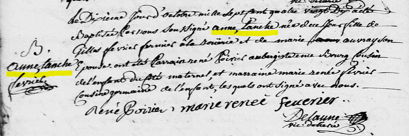 Le dixieme jour d’octobre mil sept cent quatre vingt six a été baptisée par nous soussigné Anne Tanche née de ce jour fille de Gilles FEVRIER, fermier à la Rouërie, et de Marie AUVRAY son épouse, ont été parrain René POIRIER aubergiste en ce bourg, cousin de l’enfant du coté maternel, et marraine Marie Renée FEVRIER cousine germaine de l’enfant, lesquels ont signé avec nous.