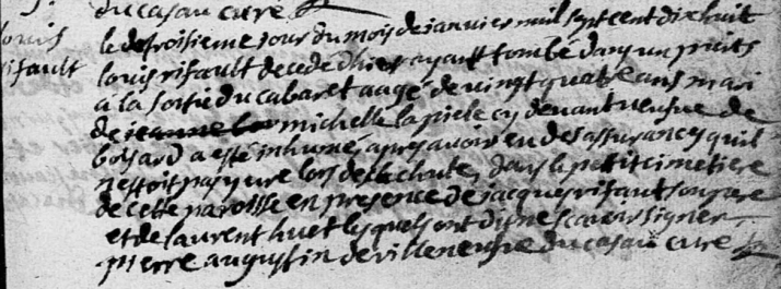 Le troisieme jour du mois de janvier mil sept cent dix huit, Louis RIFAULT décédé d’hier, ayant tombé dans un puits à la sortie du cabaret, aagé de vingt quatre ans, mari de Michelle La PIELE cy devant veufve de BOISARD, a esté inhumé après avoir eu des assurances qu’il n’estoit parjure lors de sa chute, dans le petit cimetiere de cette paroisse, en presence de Jacques RIFAULT son père et de Laurent HUET, lesquels ont dit ne scavoir signer. Pierre Augustin de Villeveusve de Casau, curé.