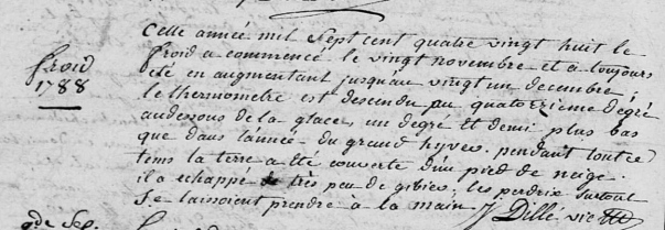 Cette année mil sept cent quatre vingt huit le froid a commencé le vingt novembre et a toujours été en augmentant jusqu’au vingt un décembre ; le thermomètre est descendu par quatorzième degré au dessous de la glace, un degré et demi plus bas que dans l’année du grand hyver. Pendant tout ce tems la terre a eté couverte d’un pied de neige. Il a échappé très peu de gibier, les perdrix surtout se laissoient prendre à la main. [Signé J. Dillé, vicaire]
