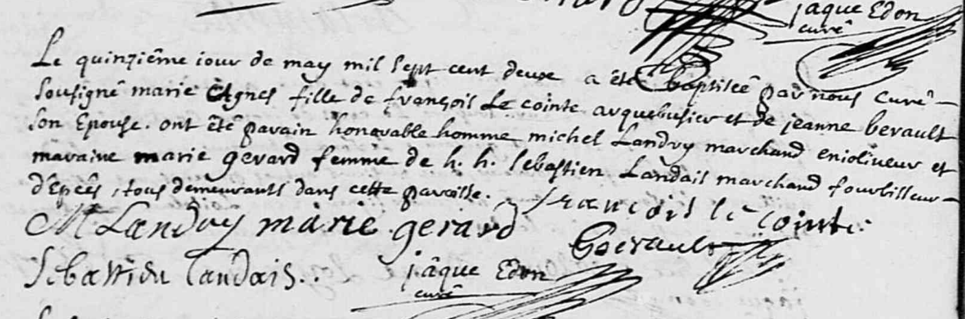 Le quinzieme jour de may mil sept cent deux a été baptisée par nous curé sousigné Marie Agnes fille de François LE COINTE arquebusier et de Jeanne BERAULT son épouse, ont été parain honorable homme Michel LANDRY marchand enjoliveur et marraine Marie GERARD femme de hh Sébastien LANDAIS marchand fourbisseur d’épées, tous demeurant dans cette paroisse.