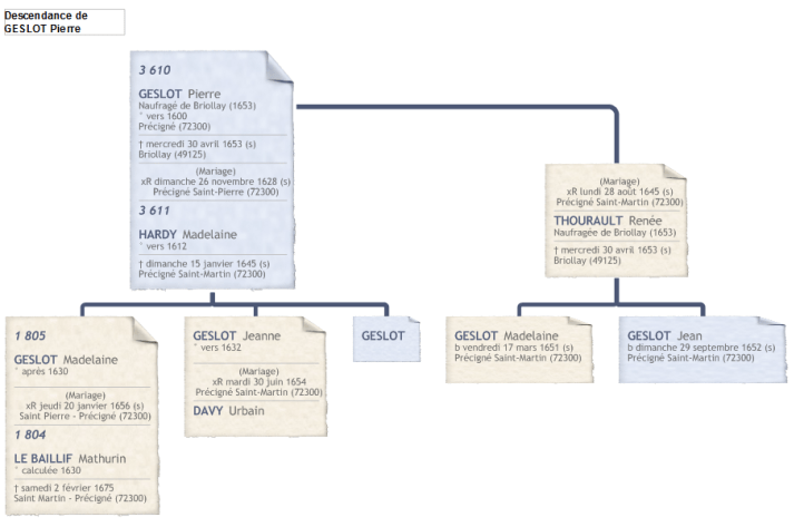 C’est ainsi que j’ai découvert que Pierre GESLOT, cité sur les registres de Briollay, n’était autre que mon ancêtre, Pierre GESLOT, natif de Précigné, marié une première fois à Madelaine HARDY, puis ayant épousé en seconde noces Renée TOURAUT.