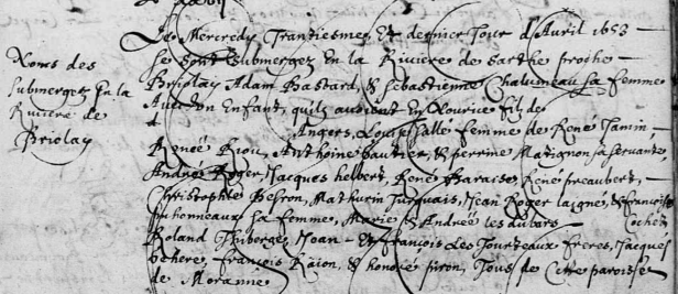 Le mercredy trantiesme et dernier jour d’Avril 1653 se sont submergez en la riviere de Sarthe proche Briolay, Adam BASTARD et Sébastienne CHALUMEAU sa femme avec un enfant qu’ilz avoient en nourice filz de [blanc] d’Angers, Louise SALLÉ femme de René JAMIN, Renée RIOU, Anthoine GAUTIER et Perrine MATIGNON sa servante, André ROGER, Jacques HELBERT, René BARAISE, René PRÉAUBERT, Christophe BESRON, Mathurin TURQUAIS, Jean ROGER l’aigné et Françoise PICHONNEAUX sa femme, Marie et Andrée les DUBARs, [blanc] COCHEE, Roland THIBERGE, Jean et François les TOURTEAUX frères, Jacques GEHERE, François RAION et Honoré PIRON, tous de cette paroisse de Moranne. [Morannes – S – 1643-1674, vue 67/219]