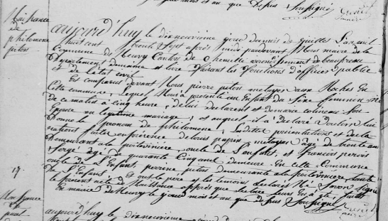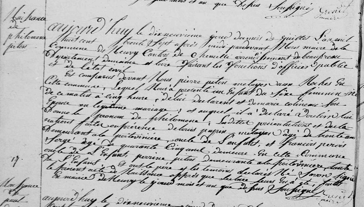 Aujourd’huy le dix neuvieme jour du mois de juillet l’an mil huit cent trente et sept après midi par devant nous maire de la commune de Neuvy, canton de Chemillé, arrondissement de Beaupréau, département du Maine et Loire, faisant les fonctions d’officier public et de l’état civil ; est comparus devant nous Pierre PITON métayer aux Roches en cette commune, lequel nous a présenté un enfant du sexe féminin, né de ce matin à cinq heures, de lui déclarant et de Marie COLINEAU son épouse en légitime mariage et auquel il a déclaré vouloir lui donné le prénom de Philomène, les dites présentation et déclaration faites en présence de Louis PAPIN métayer âgé de trente ans demeurant à La Poitevinière, oncle de l’enfant, et François PEROIS, sergé, âgé de quarante cinq ans, demeurant en cette commune, oncle de l’enfant, Perrine PITON demeurant à La Poitevinière, tante de l’enfant, et ont le père et les temoins déclarés ne savoir signer le présent acte de naissance après que lecture leur en a été faite, en mairie de Neuvy le jour, mois et an que dessus soussigné.