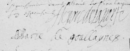 1634.03.02 – GUINOISEAU Olivier et Etienne – “enfants d’honorable homme Pierre GUYNOISEAU sieur de La Boulay et de Renée LE COINTE sa femme, après nous avoir apparu du Sacrement de baptesme qui leur avoit esté administré par Me François GRELLET prestre vicaire audit lieu de la Tour Landry, appelé au péril et nécessité de la mère pour la faiblesse desdits enfants et pour avoir suppléé … parrain audit Olivier GUINOISEAU, honorable homme Me [déchiré] COLAS sieur de La Marre et honorable femme Renée GUILLEBAULT épouse de Monsieur du Boulay GUINOISEAU marraine, et dudit Etienne GUYNOISEAU fut parrain Etienne LORIOST prestre et marraine Renée BELIARD épouse de Monsieur GELINEAU”