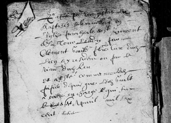Papier pour enregistrer les baptisés solennellement en l’église parochiale de St Vincent de la Tour Lendry par Clément Gault prestre curé dudit lieu et y résident ou par le vicaire dudit lieu et a esté commencé ledit papier depuis que ledit Gault a entré en charge, ce qui faut le vingt et sept apvril mil six cent trente.