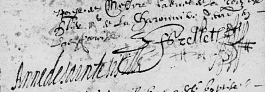 1631.04.10 – FARDIER François “fils de Sébastien FARDIER et de Renée BERNIER, parrain vénérable et discret Me François GRELLET prêtre vicaire de Saint Vincent de La Tour et marraine dame Anne De SAINTE CECILE, épouse de Messire Gabriel DE LA TOUCHE chevalier seigneur de La Charonnière demeurant en ladite paroisse”