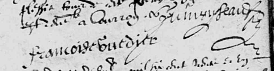 1630.12.31 – MARTINEAU Françoise “baptisé sub conditione attendu l’incertitude du baptesme conferé au logis, Françoise fille de Jacques MARTINEAU et de Michelle BARANGER demeurant à La Hunaudière, parrain François GOURICHON et Perrine BARANGER marraine”