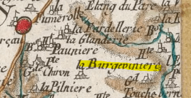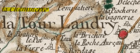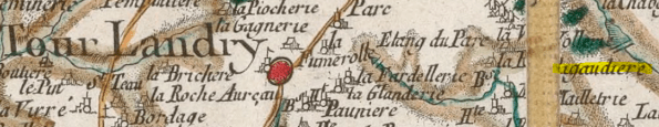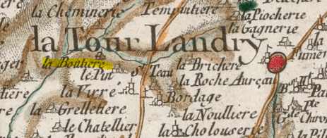 La Bordellière (La Bourdelière…). Carte Cassini : La Bordelière. Le lieu  (ou domaine) de la Bordellière, acquis de François CUISSARD par Mathurin HUMEAU, prêtre, ancien chantre de St-Léonard de Chemillé, est en 1546 de la paroisse de la Tourlandry. (C. Port, Diction. du M.et L.) [Y demeurent aux alentours de 1630 Pierre BOUSSION et Jeanne MESNARD ainsi que Jean BERNIER, métayer dudit lieu, et Perrine BOUET sa femme]