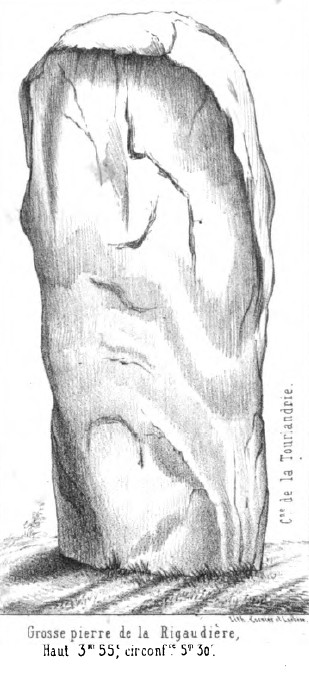 La Rigaudière – Il y existe un peulvan de 3 mètres 10 de hauteur sur 5 mètres 10 de circonférence, à 1 mètres 10 au-dessus du sol.Il porte au faîte une haute croix de pierre. (C. Port, Diction. du M.et L.)