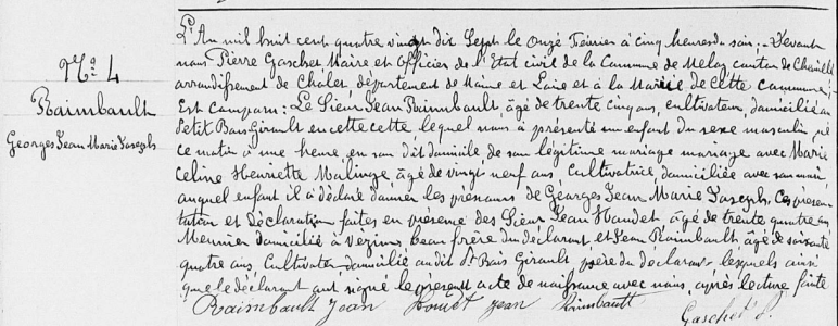 L’an mil huit cent quatre vingt dix sept le onze février à cinq heures du soir, devant nous Pierre GASCHET, maire et officier de la commune de Melay, canton de Chemillé, arrondissement de Cholet, département de Maine-et-Loire et à la mairie de cette commune, est comparu le sieur Jean RAIMBAULT, âgé de trente cinq ans, cultivateur, domicilié au Petit Bois Girault en cette commune, lequel nous a présenté un enfant du sexe masculin, né ce matin à une heure, en son dit domicile, de son légitime mariage avec Marie Céline Henriette MALINGE, âgé de vingt neuf ans, cultivatrice, domiciliée avec son mari, auquel enfant il a déclaré donner les prénoms de Georges Jean Marie Joseph, ces présentation et déclaration faites en présence des sieur Jean MAUDET âgé de trente quatre ans meunier domicilié à Vézins, beau frère du déclarant, et Jean RAIMBAULT, âgé de soixante quatre ans, cultivateur, domicilié au dit Bois Girault, père du déclarant, lesquels ainsi que le déclarant ont signé le présent acte de naissance avec nous, après lecture faite.