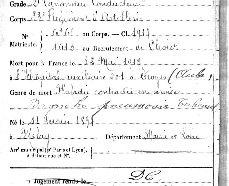 Il décède le 12 mai 1917 à l’hôpital auxiliaire n°201 de Troyes dans l’Aube d’une pneumonie contractée aux armées. Je ne sais pas s’il était depuis longtemps dans cet hôpital et s’il y a d’ailleurs un moyen de le savoir… J’espère simplement qu’une gentille infirmière aura pris soin de lui au cours de ces derniers jours… A peine avait-il eu 20 ans…
