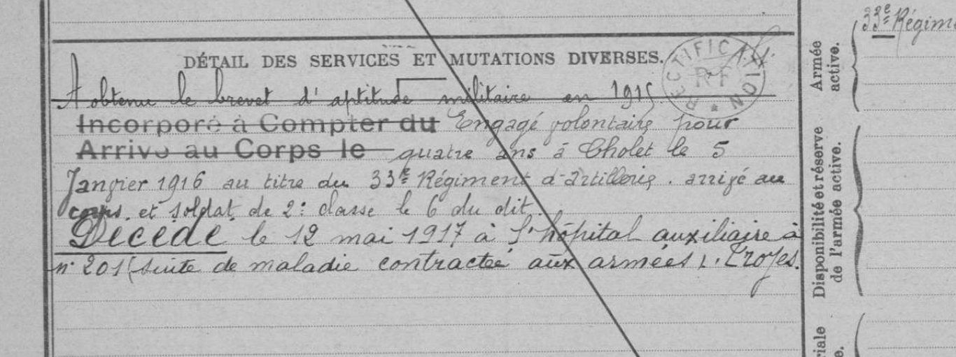 En dehors des ces renseignements habituels, sa fiche matricule est des plus laconiques. Après avoir obtenu un brevet d’aptitude en 1915, il est engagé volontaire pour quatre ans à Cholet le 5 janvier 1916 au titre du 33è Régiment d’Artillerie.