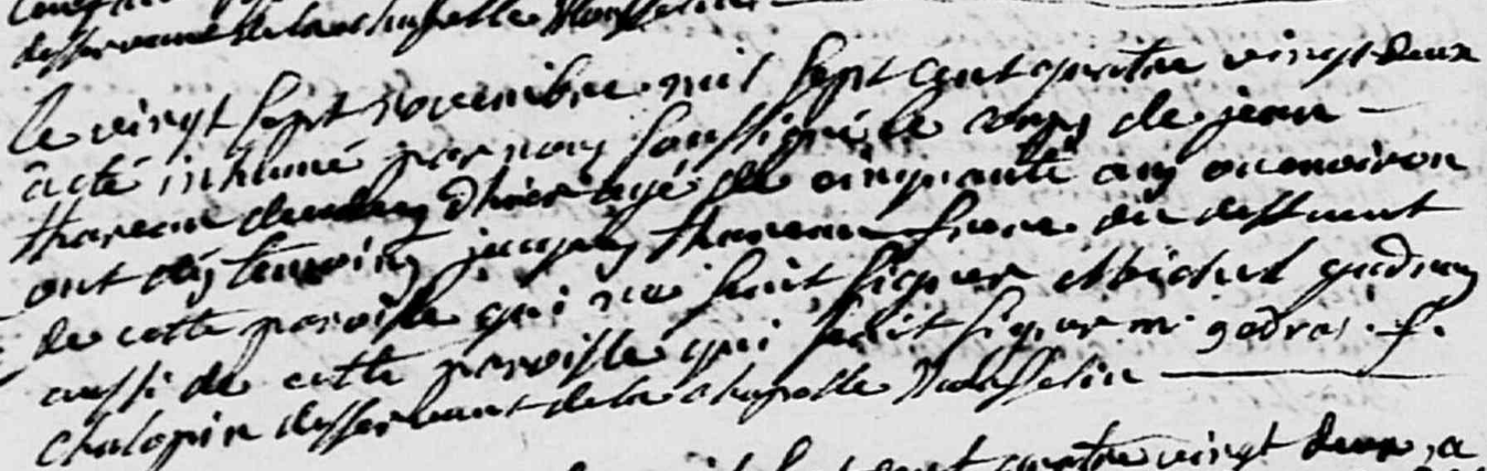 Le trois décembre mil sept cent quatre vingt deux a eté inhumé dans le cimetiere par nous soussigné le corps de Jeanne CAILLEAUX veuve Jean THAREAU decedée d’hier, agée d’environ trente trois ans, ont étés témoins René CERCLAIS fossoyeur, Thomas FRIBAULT, Jacques THARREAU tous de cette paroisse qui ne savent signer. F. Chalopin desservant de la Chapelle Rousselin.